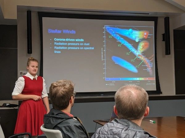 In 2017 I began graduate school in the Department of Astrophysical & Planetary Sciences at the University of Colorado-Boulder. In my time at CU I've worked on various projects, including characterization of the W42 star-forming region near the galactic center, compiling an updated atomic line database with data for more than 5 million spectral lines, computations of mass-loss rates for massive stars, and models of active galactic nuclei (AGN) outflows. I was awarded my Master of Science in 2019, and defended my Ph.D. in May 2024. My work has been featured in the American Astronomical Society's Journal Author Series, and in 2022 I was awarded the Future Investigators in NASA Earth and Space Science and Technology (FINESST) grant for my work on AGN winds. In October 2024 I joined Dr. Sera Markoff's group at the University of Amsterdam, where I currently work on general relativistic ray-tracing to simulate images of black holes.